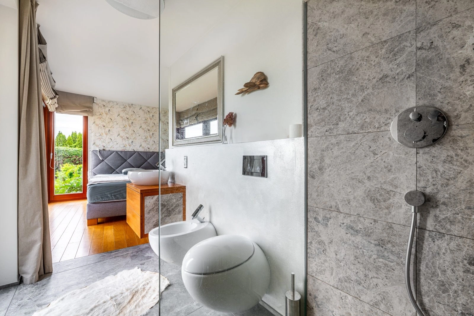 přízemí – prostorná vstupní místnost do L s vestavěnými skříněmi, technická místnost s el. kotlem zařízená a vybavená jako prádelna, dva samostatné dětské pokoje, prostorná ložnice s prosklenou stěnou do zahrady a s vlastní koupelnou, větší šatna s vestavěným šatním nábytkem, samostatná koupelna s vanou, umyvadlem, bidetem a WC, samostatný televizní a poslechový pokoj, velice prostorná, otevřená, hlavní obytná místnost, zde obývací část, jídelní prostor s proskleným vstupem do zahrady a na terasu se zařízenou pergolou, kuchyňský prostor s pultem, otevřený podhled do podkroví, schodiště do podkroví,