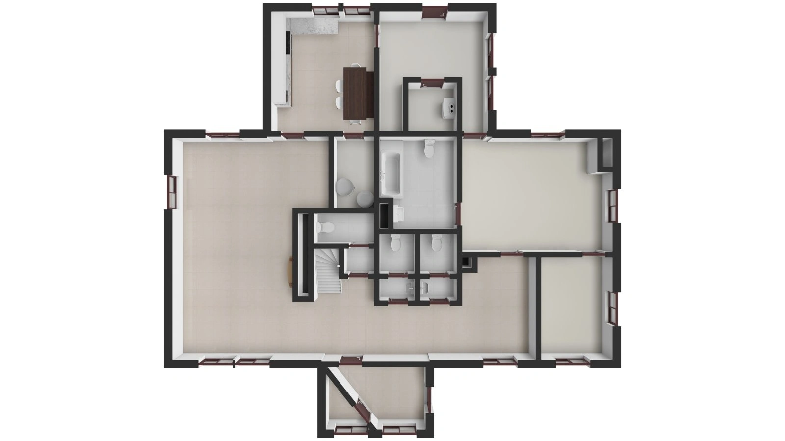 Obytné podkroví: pokoje (apartmány) – pokoje jsou vybaveny vlastní koupelnou se sprchovým koutem a WC (viz. půdorys). Dva z apartmánů mají vstup na společný balkon ve štítu domu s výhledem do krajiny, dále prostorná půda.